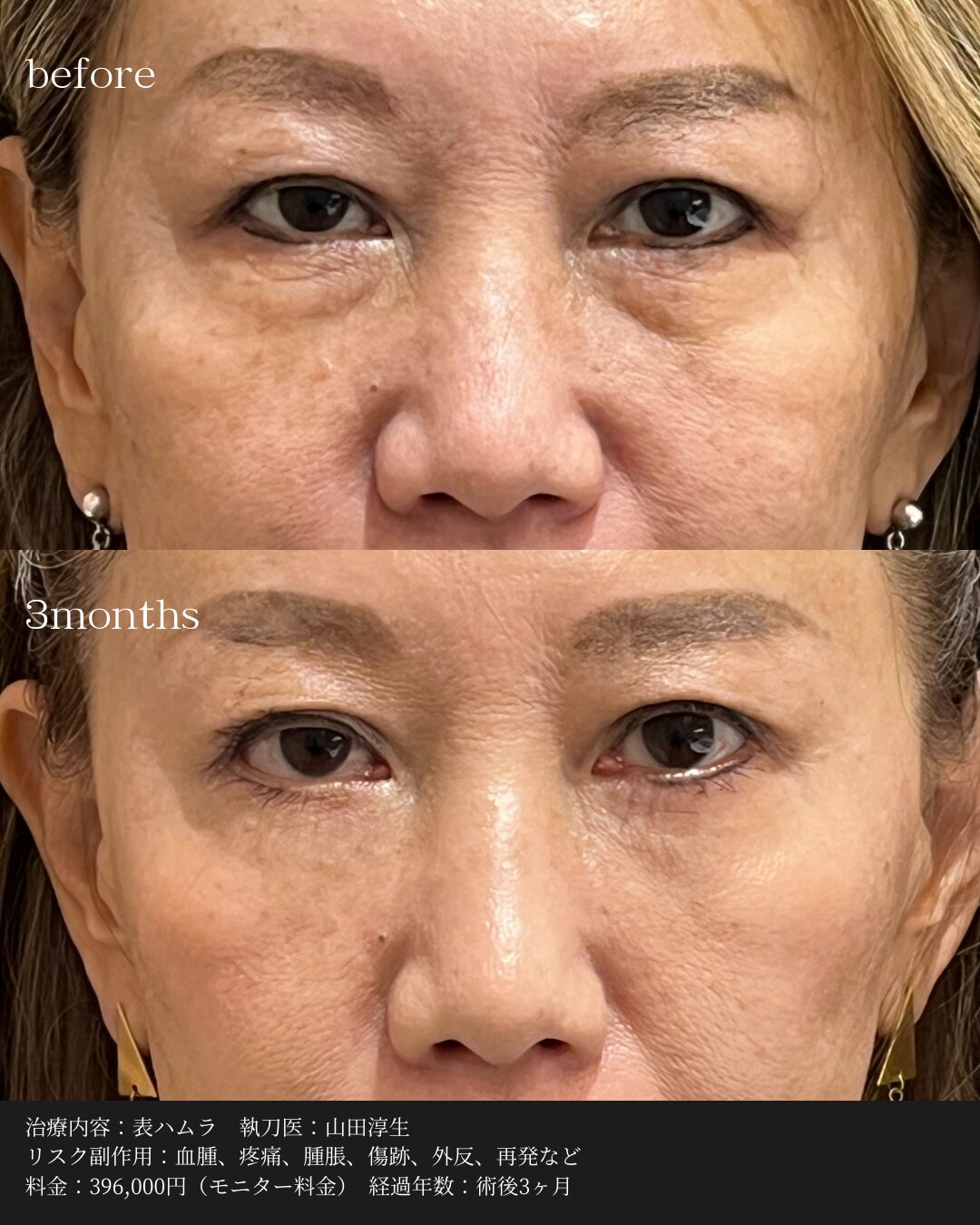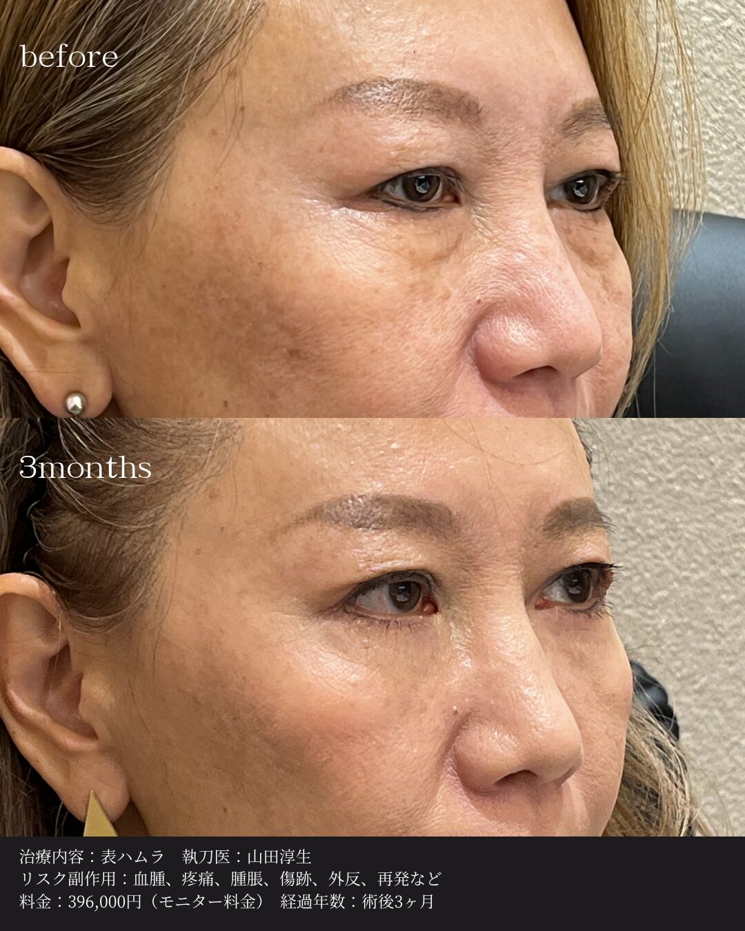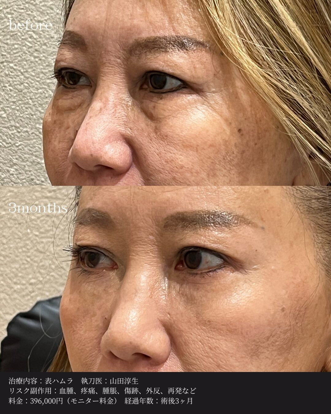 表ハムラ:睫毛下を切開し、たるみの原因となっている脂肪を部分切除、移動させて、凹みのある個所に固定し直します。シワの原因となっている余剰皮膚も切除することで、シワの改善にも効果が期待できます。 料金:506,000円~※料金は変更となる可能性がございます リスク・副作用:腫れ、内出血、感染、下眼瞼の外反、眼窩脂肪の取りすぎ、眼窩脂肪の取り残し、下斜筋の損傷 等