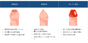 以下の図は、それぞれの包茎タイプにおける外見的な特徴と、主な症状をまとめた比較表です。セルフチェックの参考にしてください。