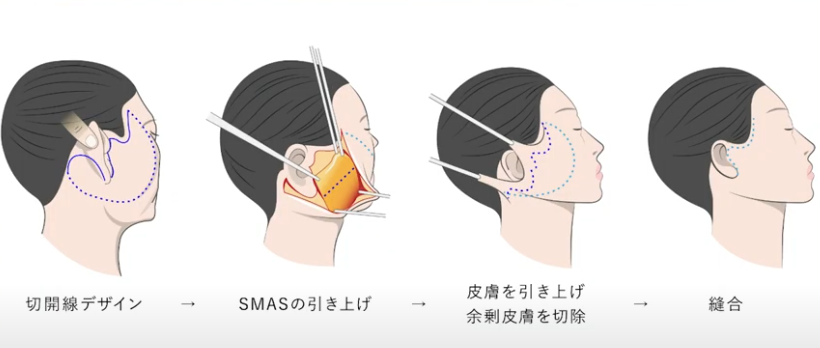 フルフェイスリフト:皮膚を切開し、余分な筋膜や皮膚を切除することでお顔のたるみが改善されます。