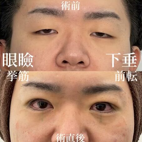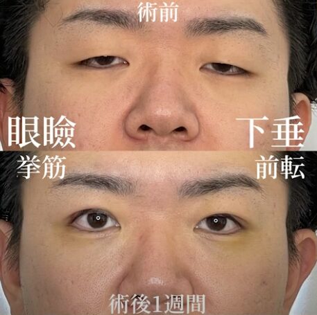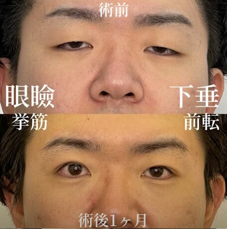 術後1ヶ月後の写真では、腫れも引き、自然な仕上がりと改善した目の開きが確認されています。 これにより、術前の「目を開きにくい」「眉毛を使って無理に開けていた」といった症状から解放され、頭痛や肩こりの原因となっていた負担が軽減されることが期待できます。