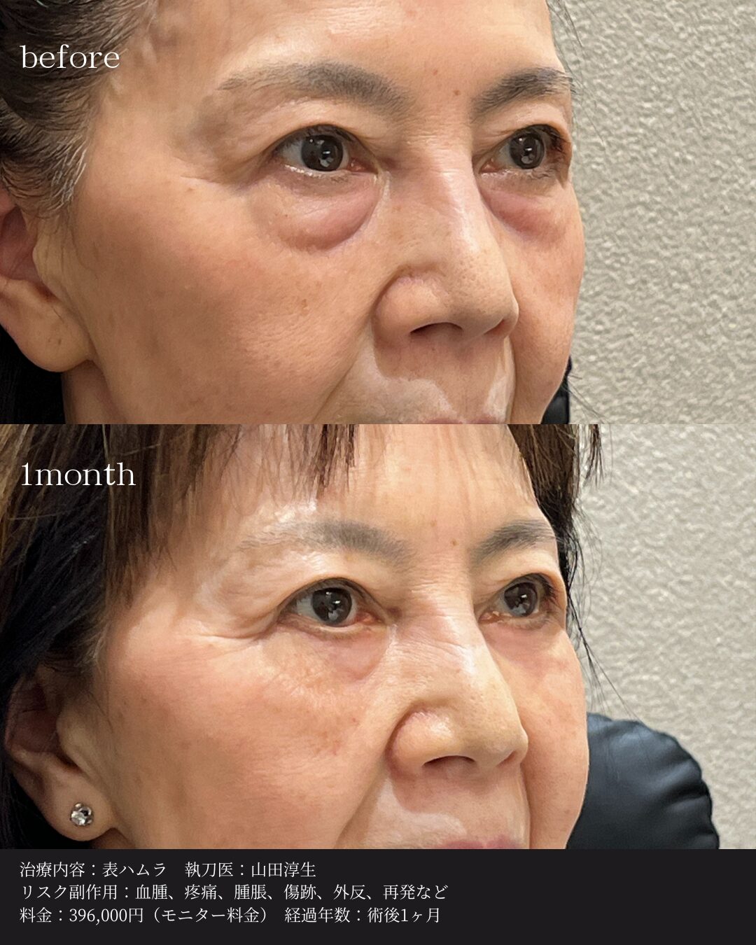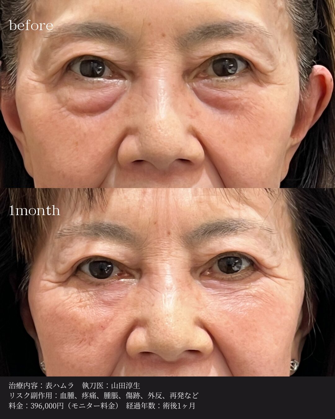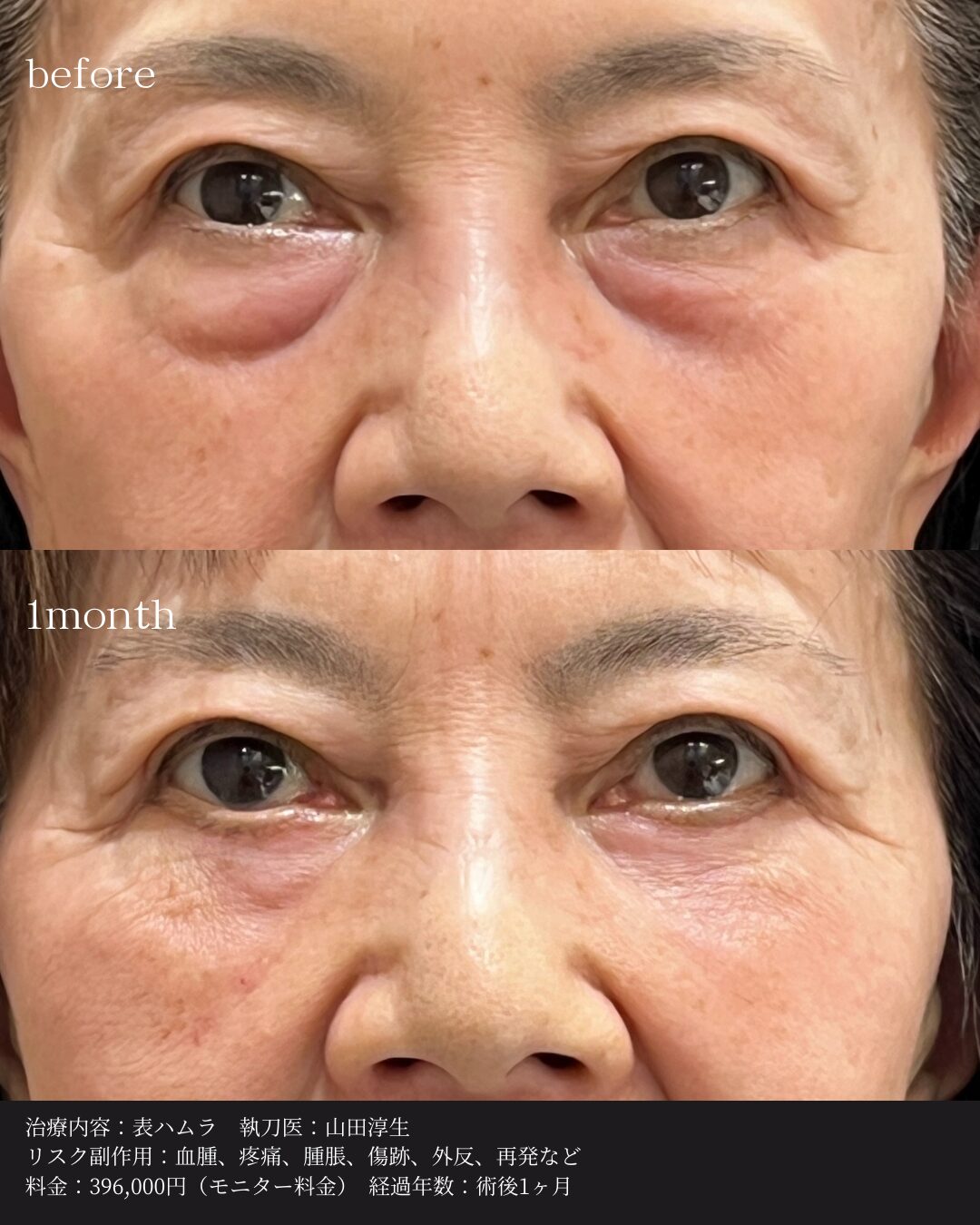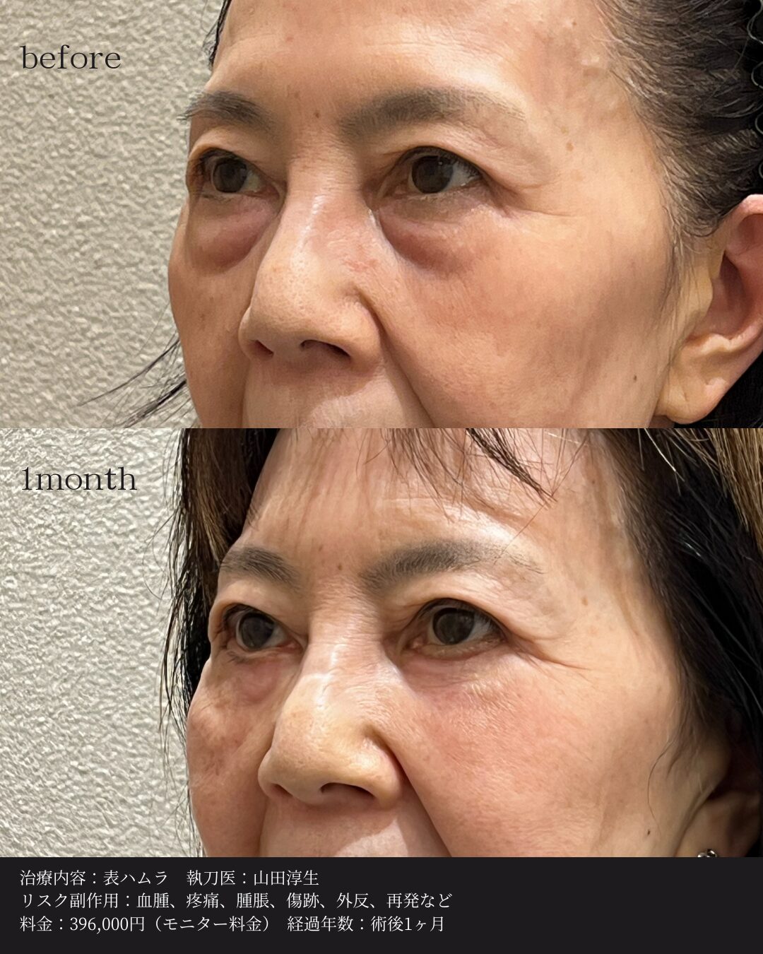 表ハムラ:睫毛下を切開し、たるみの原因となっている脂肪を部分切除、移動させて、凹みのある個所に固定し直します。シワの原因となっている余剰皮膚も切除することで、シワの改善にも効果が期待できます。 料金:506,000円~※料金は変更となる可能性がございます リスク・副作用:腫れ、内出血、感染、下眼瞼の外反、眼窩脂肪の取りすぎ、眼窩脂肪の取り残し、下斜筋の損傷 等
