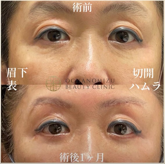 • 50代女性の事例:眼瞼下垂の挙筋前転術と表ハムラ法、さらに目頭切開の3つの手術を同時に行いました。目頭切開は50代〜60代の方の場合、顔の印象が大きく変わらないよう控えめにすることが多いですが、ご希望に応じて行われます。これらの施術により、目元の開きの改善、多重瞼の状態の改善、下まぶたのたるみやシワの予防と改善が同時に実現され、目元全体のアンチエイジングを1日で完了することができました。