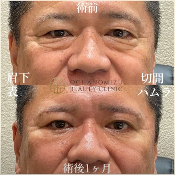 • 60代男性の事例:この方も眉下切開と表ハムラ法を同時に行いました。術後1週間でも、眉毛や下まぶたの傷跡はほとんど目立たず、シワの改善だけでなく、昔あった二重のラインが再び現れ、非常に満足されていました。