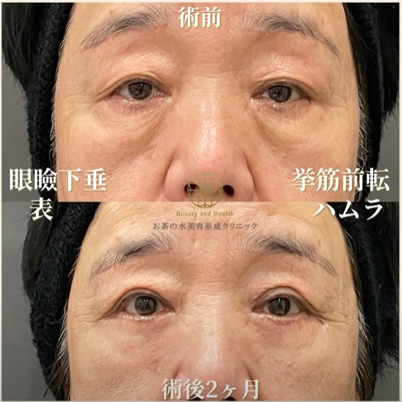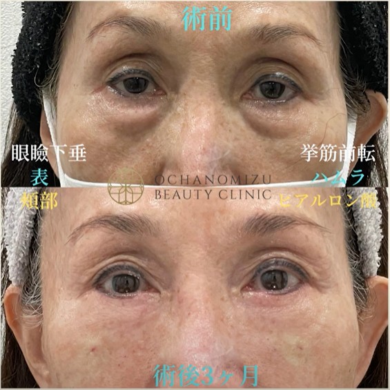 • 60代女性の事例:目の開きにくさ(眼瞼下垂)や、目の下のたるみ・痩せが気になっていたこちらの患者様には、眼瞼下垂の挙筋前転術と表ハムラ法を同時に実施し、さらに頬の痩せにはヒアルロン酸注入を併用しました。術後3ヶ月の時点で、目の開きが改善されただけでなく、眼瞼下垂の治療により目元のくぼみも改善されました。目の下のたるみや凹み、頬の痩せも改善され、大幅なアンチエイジング効果が見られました。